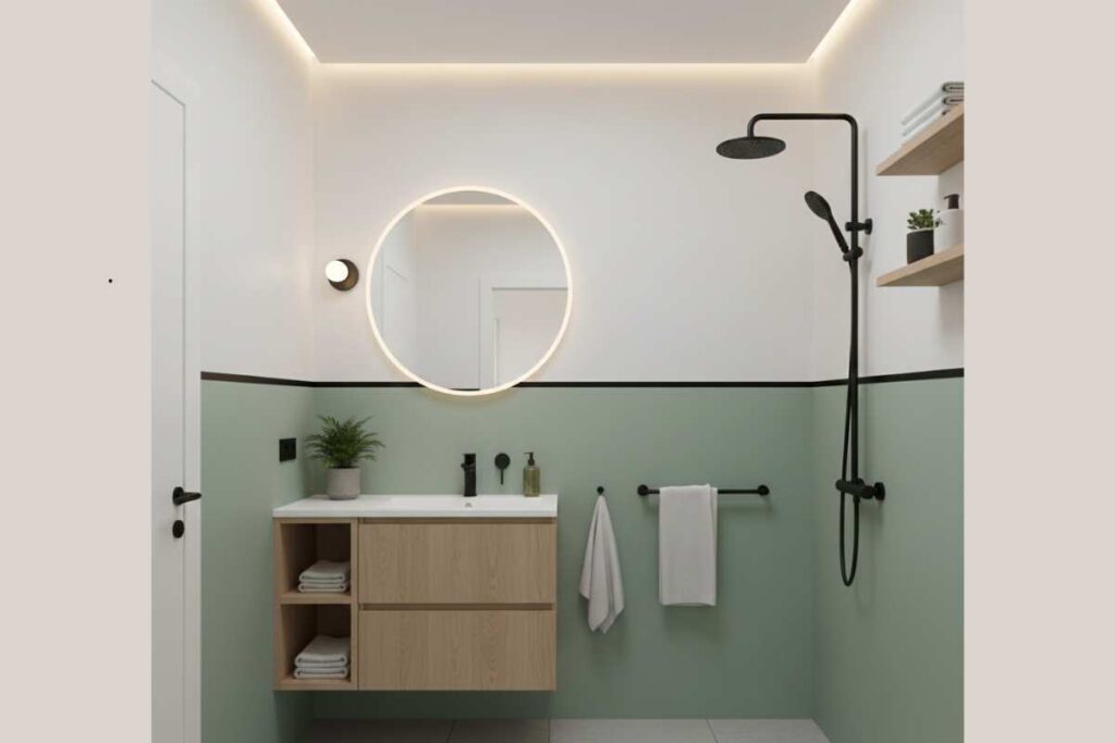Pintar metade da parede com um tom suave como o verde sálvia e manter a parte superior branca cria um contraste leve e moderno. O visual fica elegante e harmonioso com elementos em madeira clara e metais pretos.