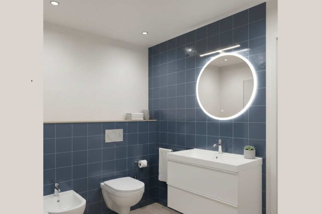 Em banheiros pequenos, as cores claras ajudam a ampliar visualmente o espaço e refletem melhor a luz. Tons como branco, bege, cinza claro e verde-água deixam o ambiente mais leve e arejado.