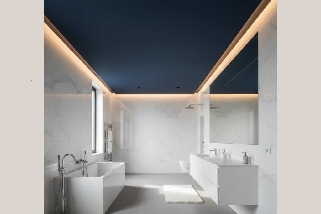 O teto também pode receber cor. Um tom contrastante cria efeito moderno e ajuda a definir o estilo do banheiro. Prefira tinta acrílica fosca, que disfarça imperfeições e reduz reflexos, além de resistir bem ao vapor.