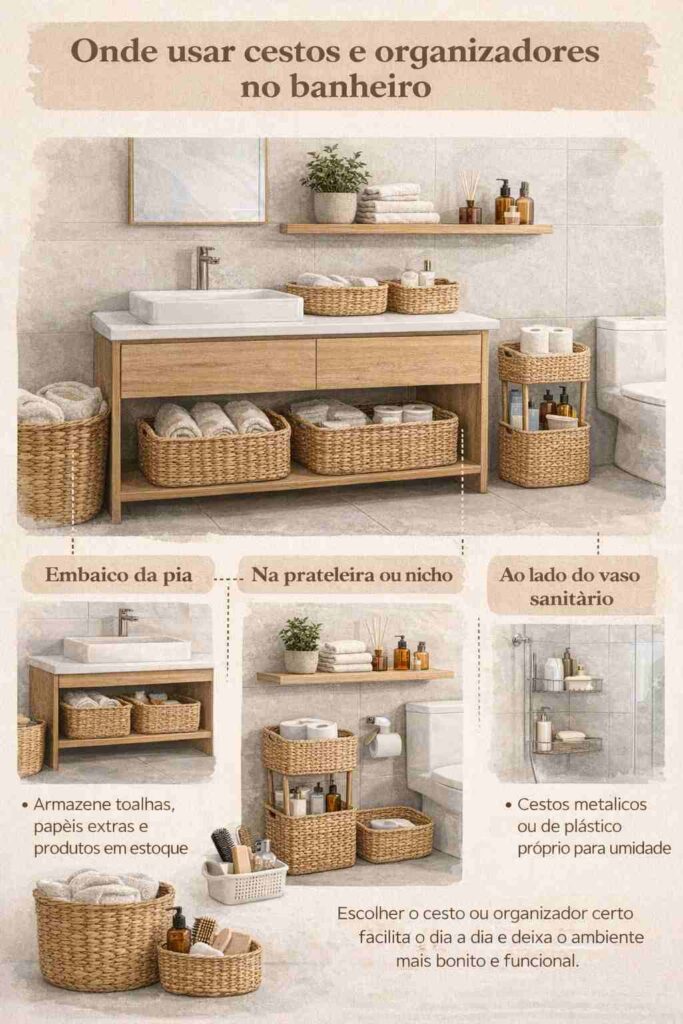 Este infográfico mostra onde usar cada tipo de cesto e organizador, ajudando a manter a casa prática, organizada e harmoniosa no dia a dia.