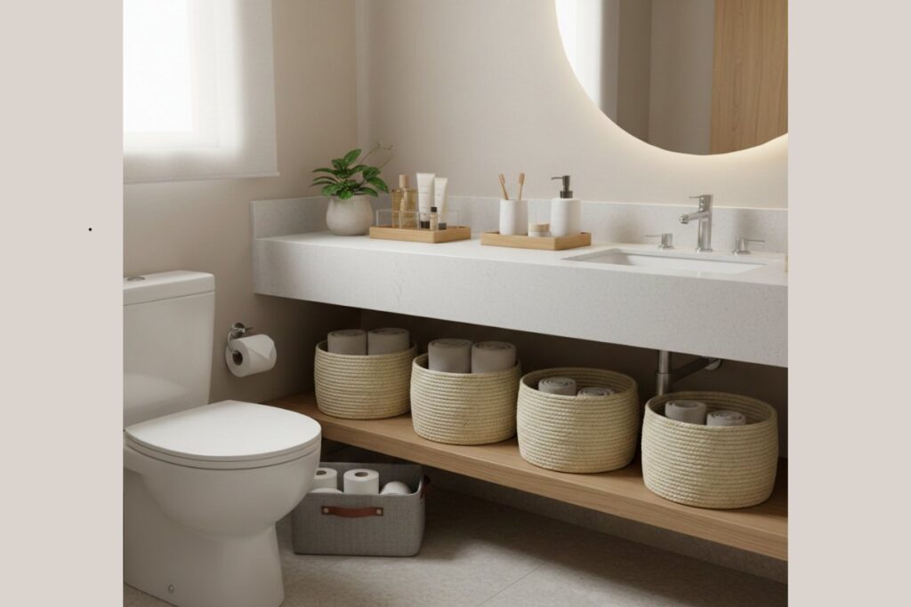 Use cestos maiores para guardar toalhas extras, papel higiênico e estoque de produtos. Cestos retangulares ou empilháveis são os mais indicados.