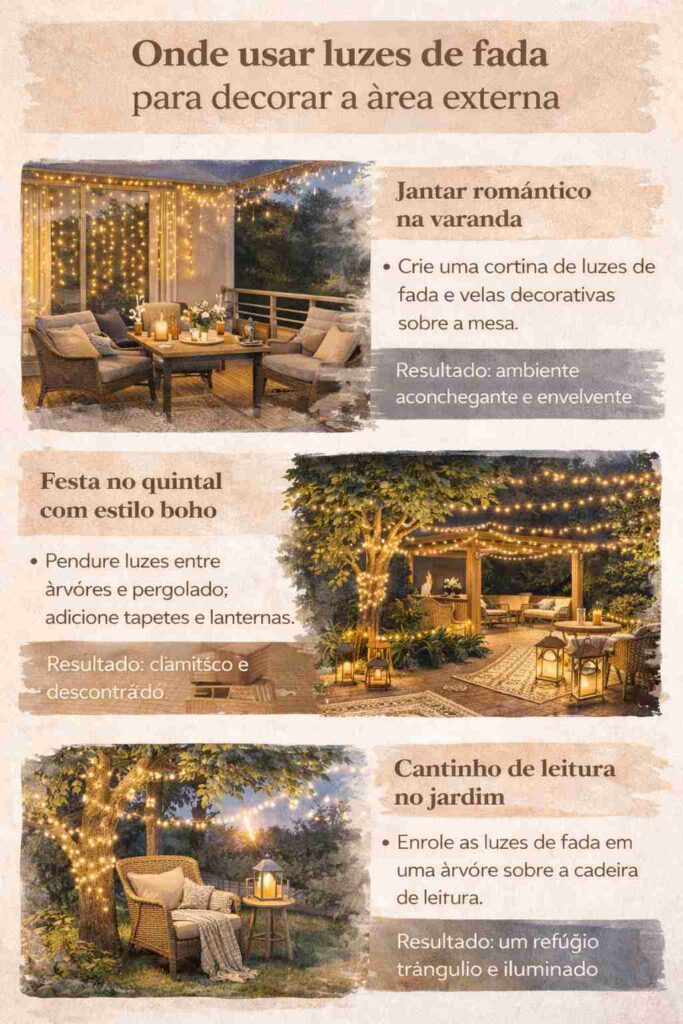 Este infográfico mostra onde usar luzes de fada para decorar a área externa, com ideias práticas para aplicar em varandas, jardins, quintais e áreas gourmet.