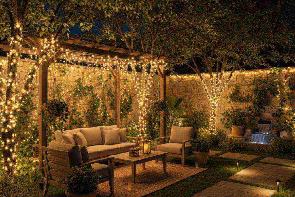 Luzes de fada funcionam bem sozinhas, mas também podem ser combinadas com lanternas, tochas, velas ou spots embutidos para criar camadas de iluminação e destacar elementos diferentes do ambiente.