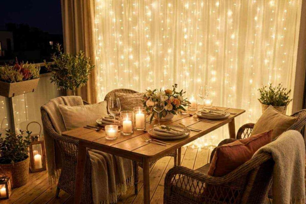 Enrole as luzes ao redor de grades, corrimãos ou pendure no teto como cortina de luz. Essa técnica valoriza o espaço e cria um cantinho de descanso iluminado com suavidade.