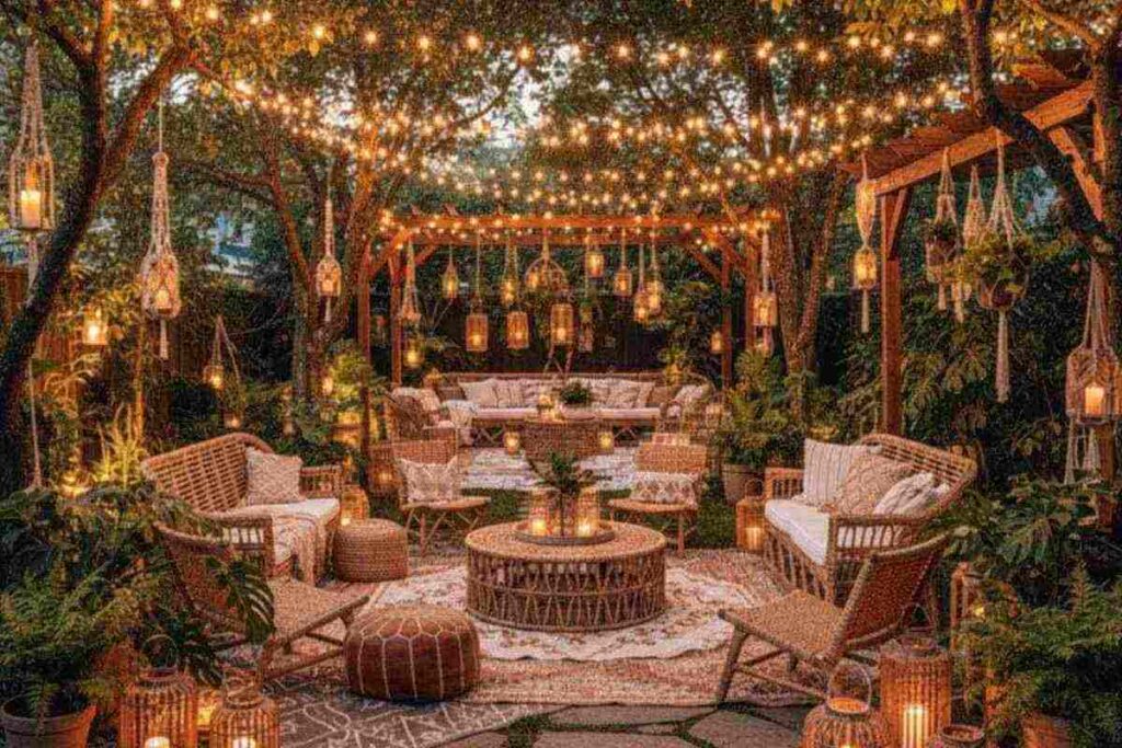 Combine com móveis de palha, tapetes, lanternas e plantas para reforçar o estilo boho. A iluminação suave deixa o ambiente convidativo sem ofuscar.