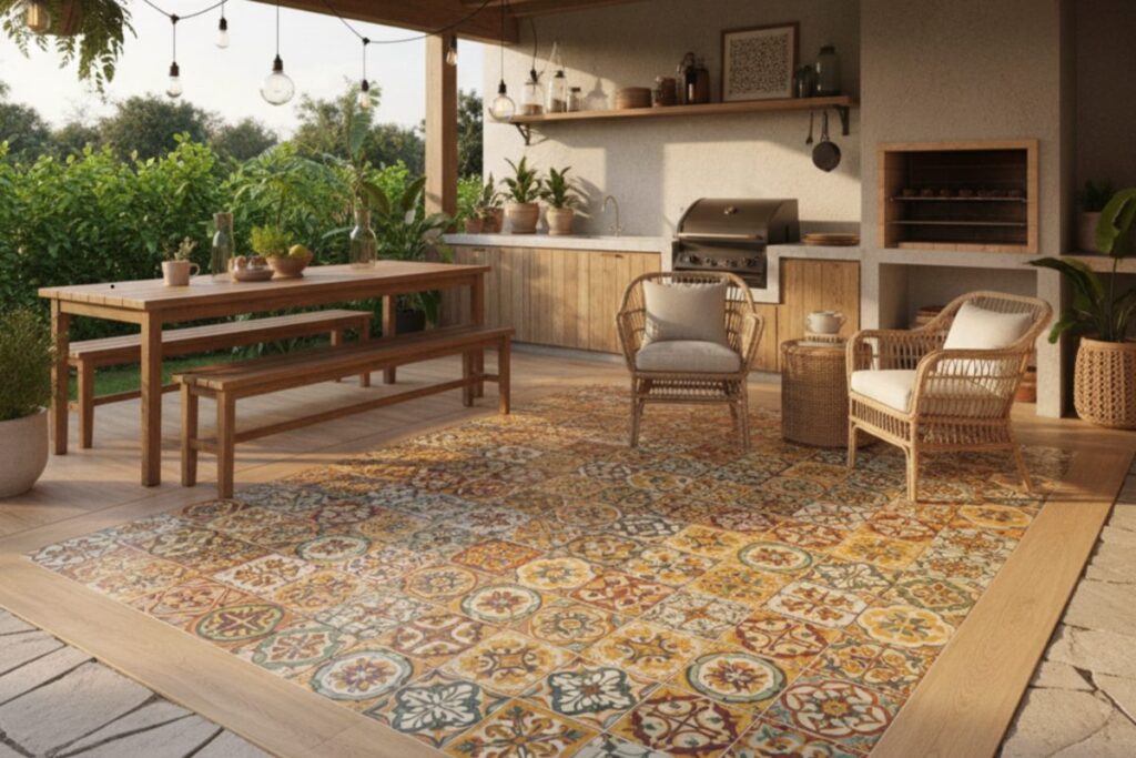 | Área de convivência | Cerâmica decorativa ou ladrilho | Combine com móveis de fibras naturais |
