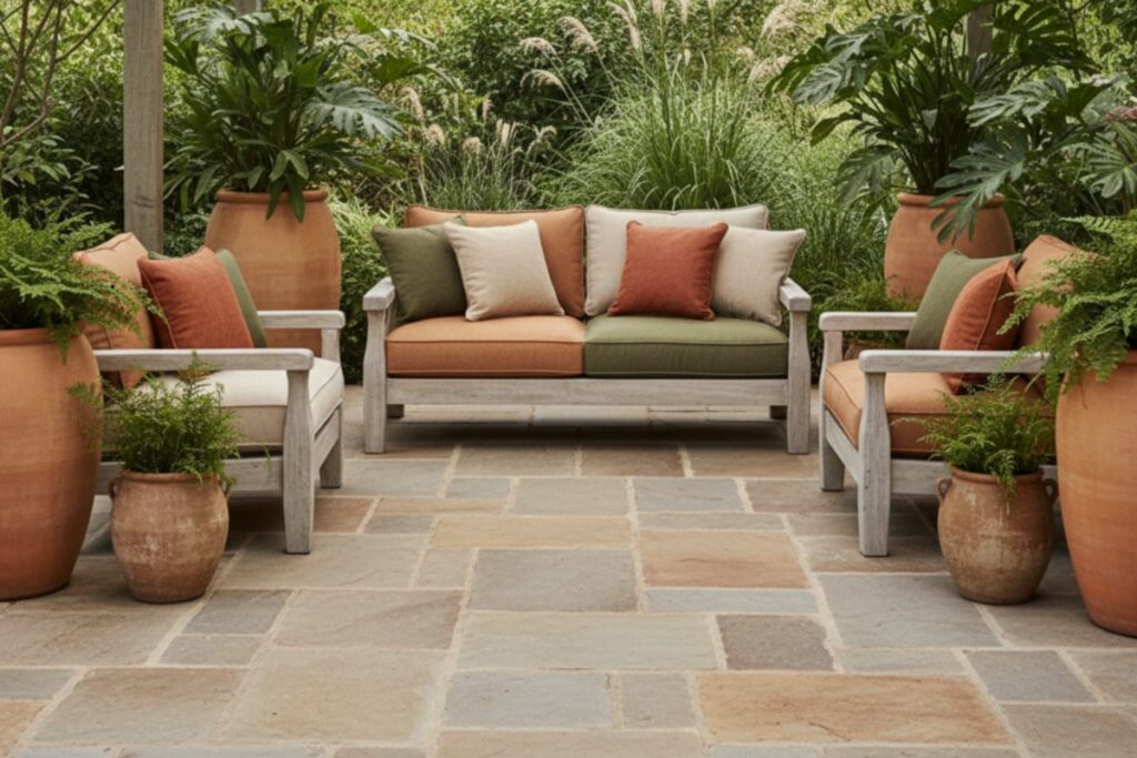 Use pedras naturais ou porcelanato que imita pedra para criar uma base neutra e aconchegante. Combine com móveis de madeira, plantas em vasos grandes e almofadas em tons terrosos.