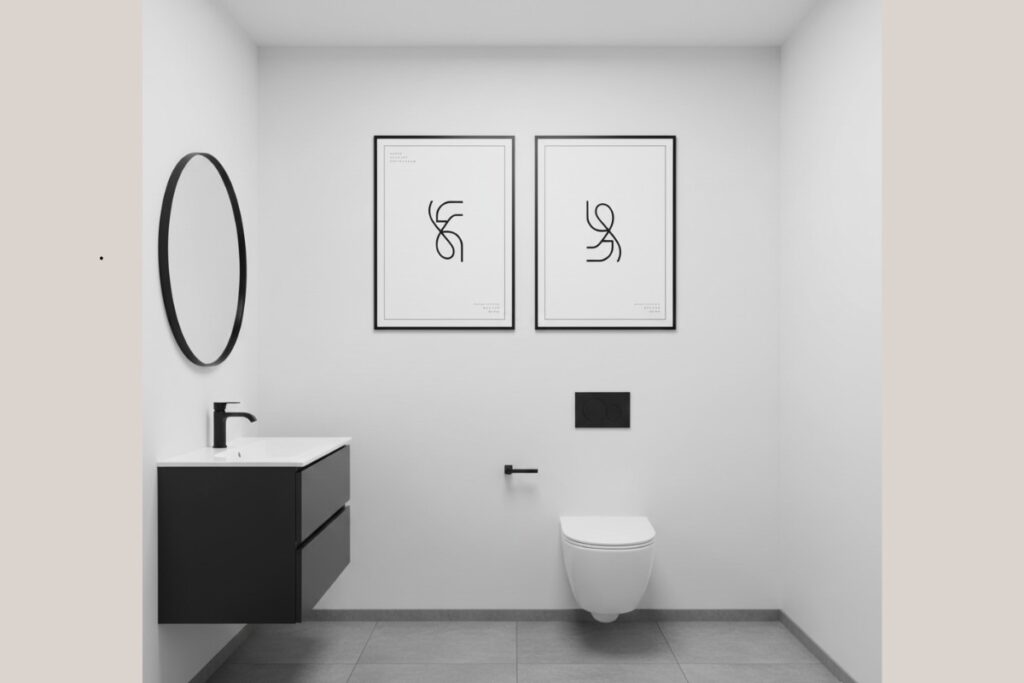 Em banheiros com acabamento em branco e preto, os pôsteres minimalistas funcionam muito bem.