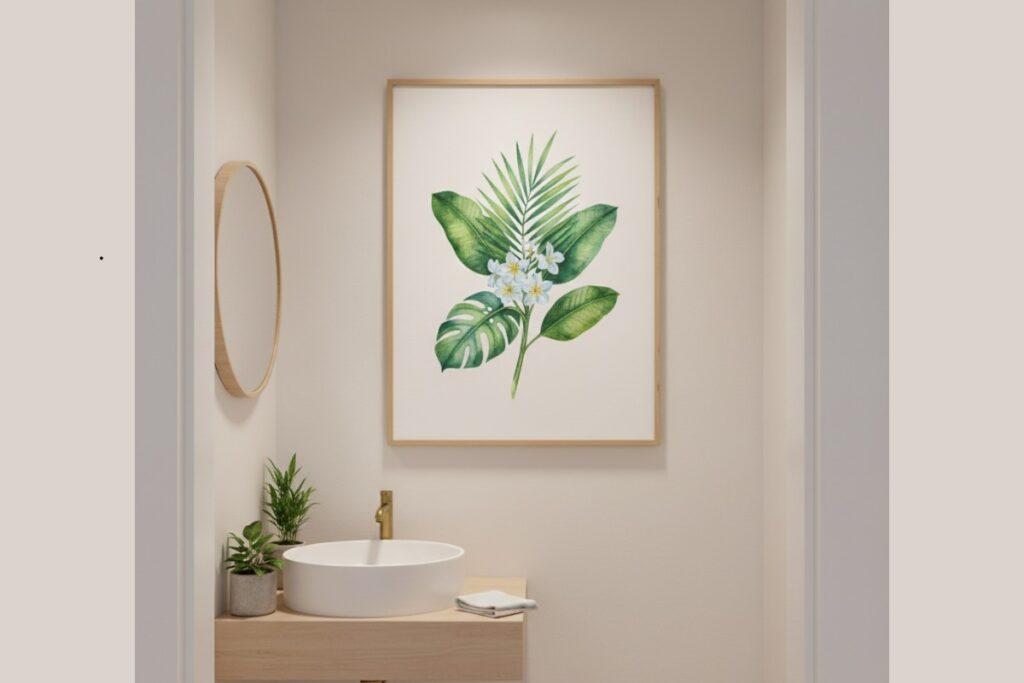 No lavabo pequeno, o pôster botânico ajuda a trazer cor sem pesar no espaço. Ilustrações de folhas verdes ou flores aquareladas criam sensação de frescor.
