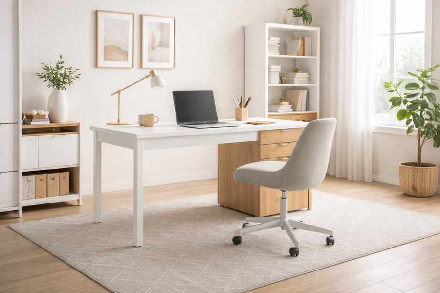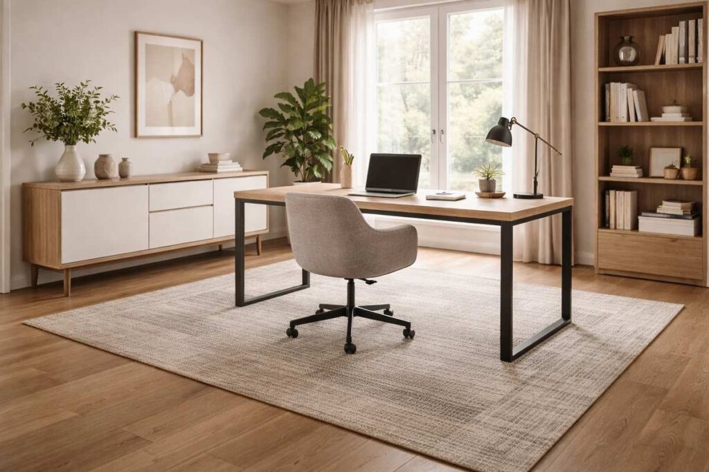 Um home office com móveis brancos e madeira clara pode ganhar vida com um tapete cinza ou bege. O modelo liso ou com padrão geométrico suave traz sofisticação sem pesar na decoração.