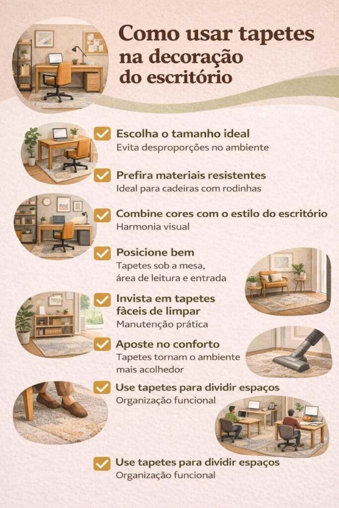 Neste infográfico, você confere como usar tapetes na decoração do escritório, com dicas práticas para escolher o modelo ideal, posicionar corretamente e harmonizar com o estilo do ambiente sem comprometer a circulação ou a rotina.