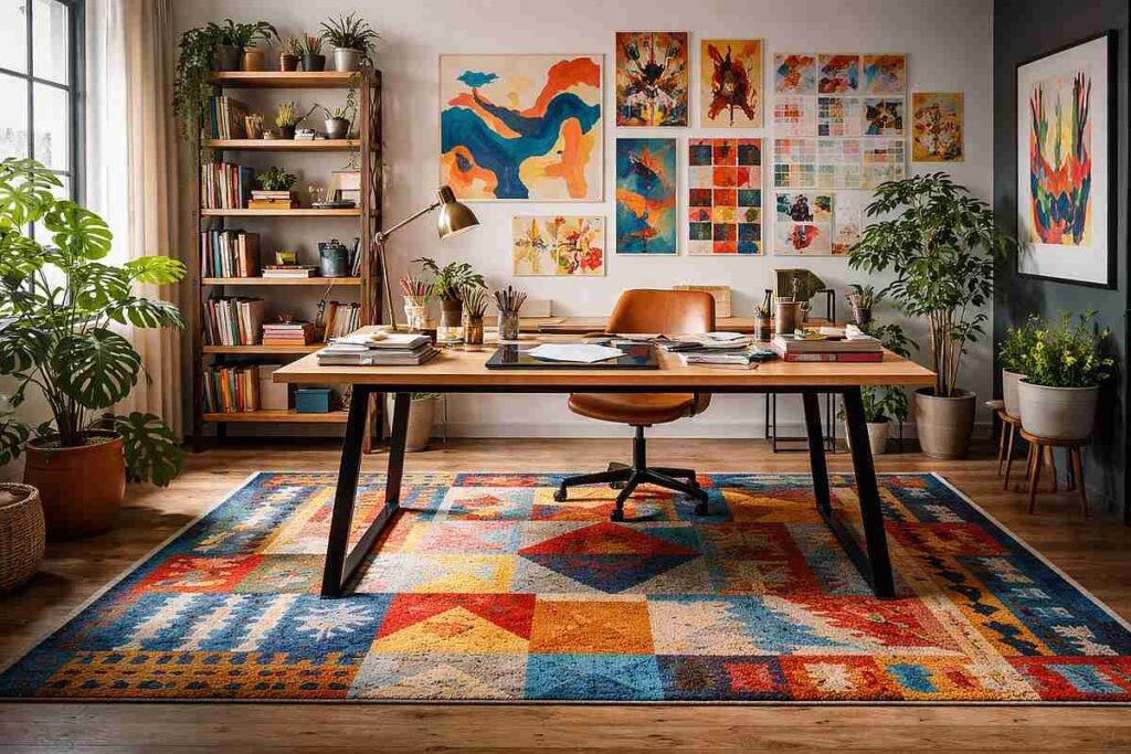 Exemplo 2: escritório criativo com tapete colorido