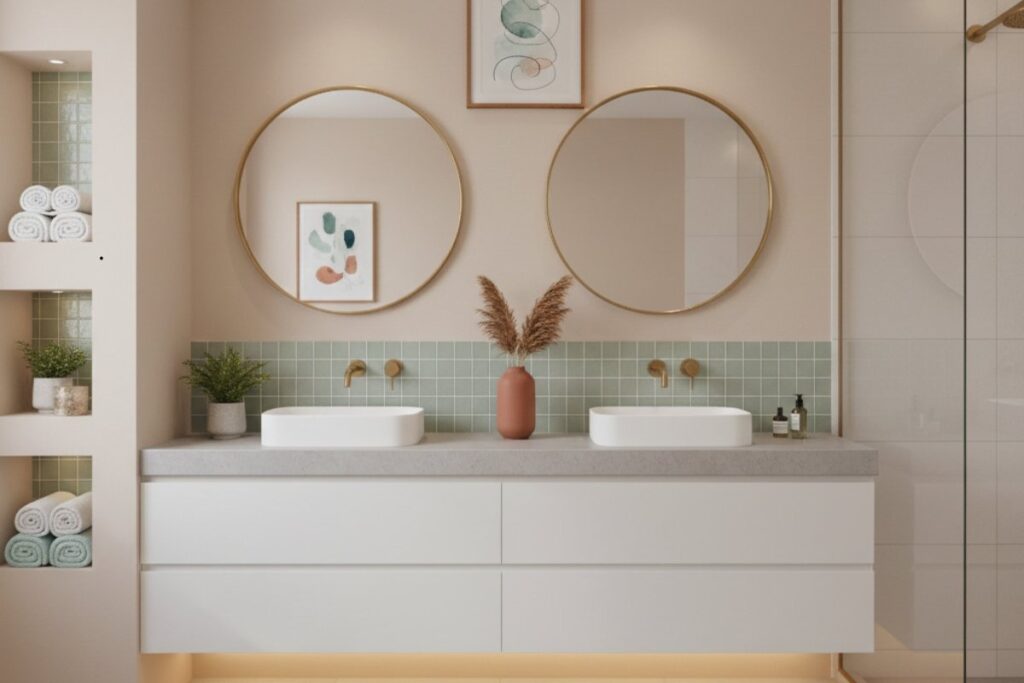 O mais importante é escolher uma paleta que combine estética e sensação. Banheiros são espaços íntimos e exigem conforto visual.