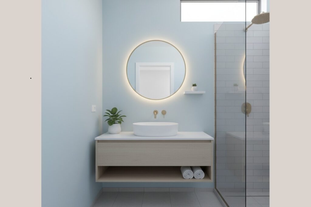 Parede em azul pastel, pia branca com gabinete suspenso, espelho redondo e plantas pequenas criam um visual leve e relaxante. Ideal para espaços com pouca luz natural.