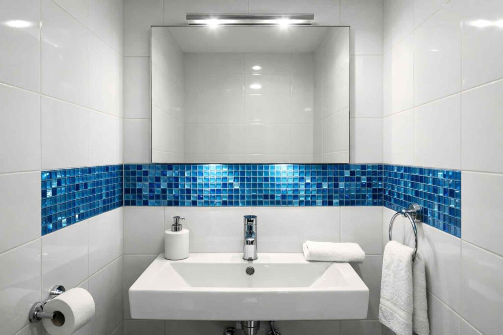 Exemplo 1: banheiro pequeno com faixa de pastilhas na pia