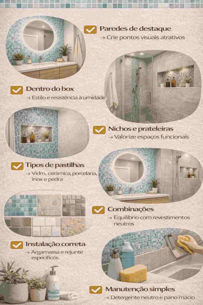 Neste infográfico, você vai ver onde usar pastilhas no banheiro e como aplicá-las de forma prática, evitando excessos e escolhendo os pontos certos para um resultado funcional e equilibrado.