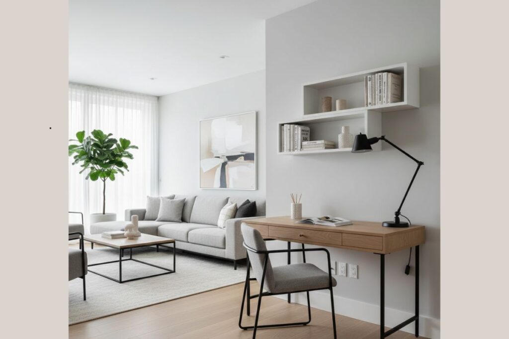Opte por modelos com design reto e minimalista. Mesas de madeira clara, metal preto ou vidro temperado funcionam muito bem. O tamanho deve ser proporcional ao espaço disponível.