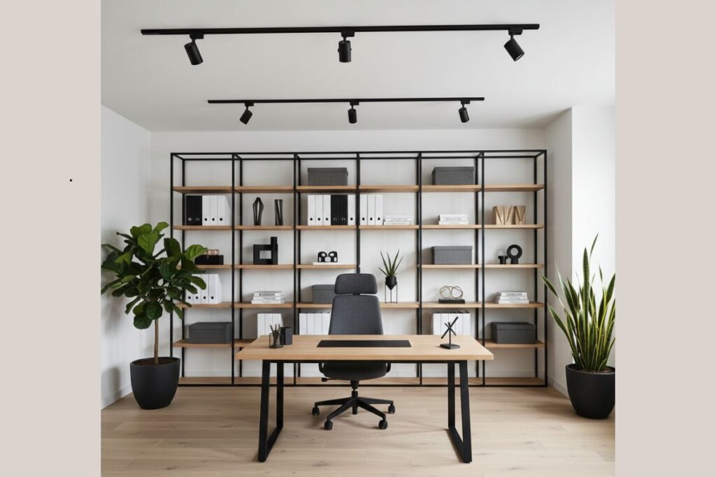 Invista em uma mesa ampla, cadeira ergonômica de alta qualidade, iluminação em trilho no teto e estante modular na parede lateral. Adicione plantas e objetos de design.