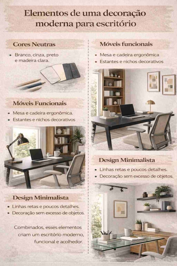 Este infográfico reúne os principais elementos de uma decoração moderna para escritório, ajudando a montar um espaço atual, prático e alinhado às necessidades do dia a dia.