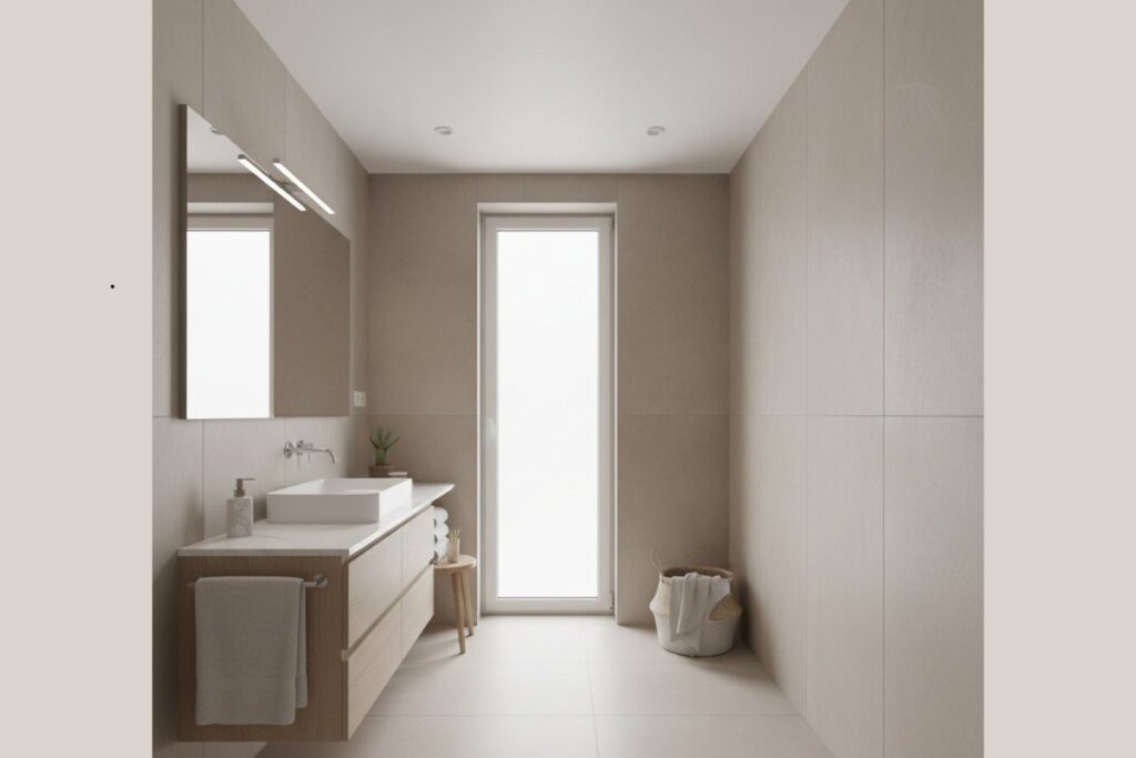 O porcelanato é um dos revestimentos mais usados em banheiros neutros. Tons como bege, cinza claro e areia ajudam a manter o ambiente elegante e fácil de combinar com diferentes estilos de decoração.