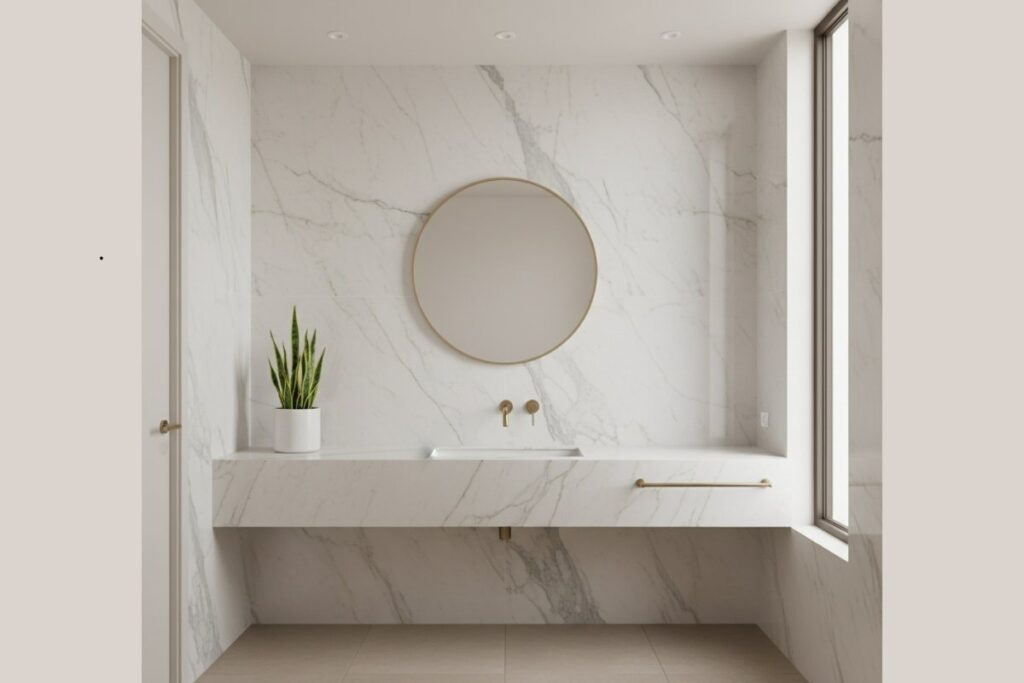 Superfícies que reproduzem mármore, travertino ou granito são muito utilizadas em projetos com paleta neutra. Esses materiais trazem veios e variações de tonalidade que quebram a monotonia das cores lisas.