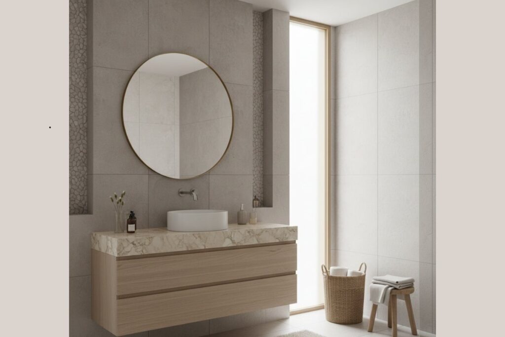 Tons como cinza médio ou grafite podem aparecer em metais, nichos, molduras de espelho ou acessórios. Eles ajudam a dar profundidade ao ambiente. - Combine cores com diferentes materiais