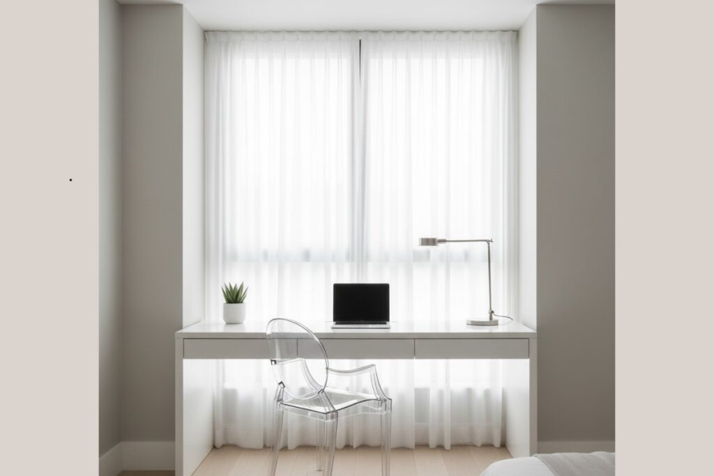Evite posicionar a mesa com a luz diretamente atrás da tela para não gerar reflexos. Cortinas leves ajudam a filtrar o excesso de claridade sem escurecer o ambiente.