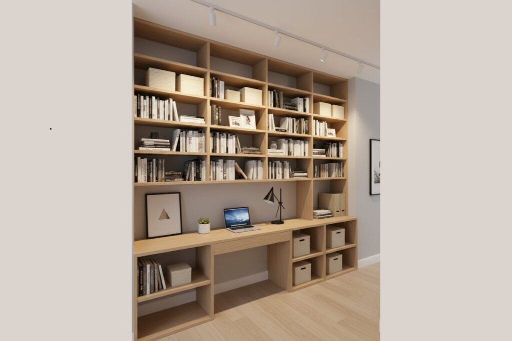 Prateleiras ocupam toda a parede acima, servindo para livros, porta-retratos e caixas organizadoras. A iluminação em trilho traz charme moderno ao ambiente.