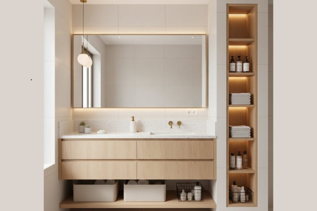 Em banheiros pequenos, a organização precisa ser ainda mais estratégica. Veja algumas ideias práticas que economizam espaço e mantêm o visual agradável.