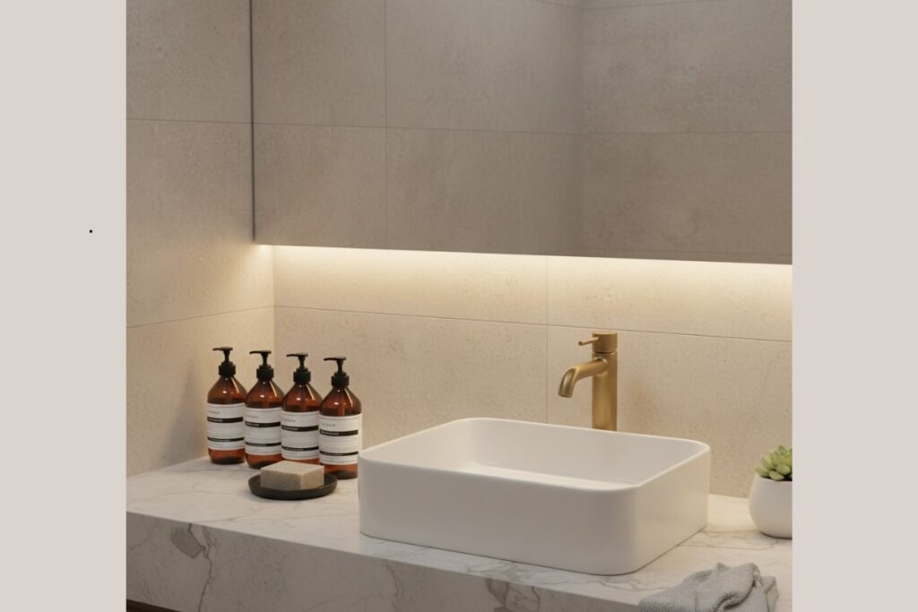 A bancada deve ter apenas o que é usado todos os dias. Itens como sabonete líquido, escova de dentes e hidratante podem ficar à vista, desde que bem organizados. Use bandejas pequenas para agrupar produtos e evitar a sensação de bagunça.