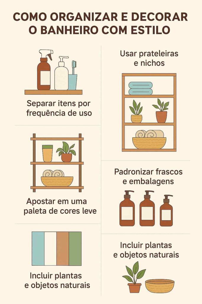 Organizar e decorar o banheiro com estilo é mais simples do que parece. No infográfico abaixo, você encontra dicas práticas para otimizar o espaço, escolher acessórios funcionais e criar um ambiente bonito, moderno e acolhedor.