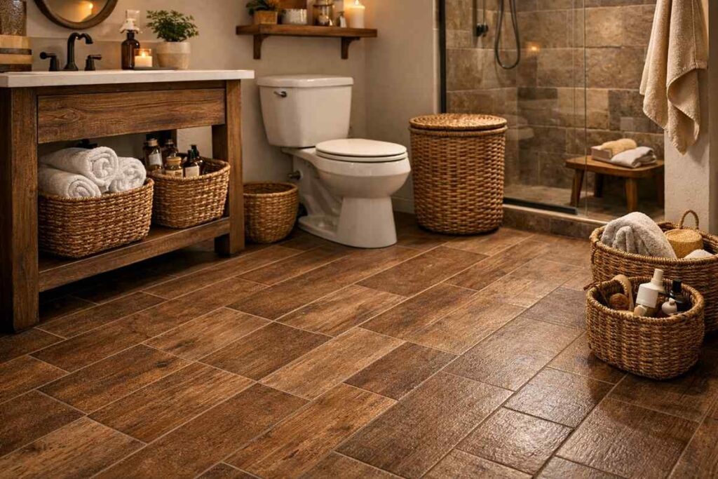 Um banheiro com piso de cerâmica antiderrapante imitando madeira pode trazer charme e segurança. Complemente com cestos de palha para guardar toalhas e uma iluminação quente para deixar o ambiente acolhedor.