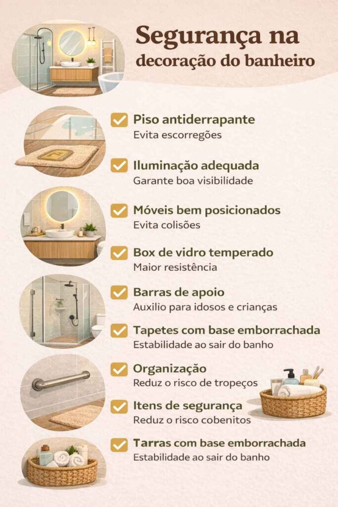 Neste infográfico, você confere orientações práticas sobre segurança na decoração do banheiro, com soluções simples que ajudam a tornar o ambiente mais funcional, confortável e seguro para toda a família.