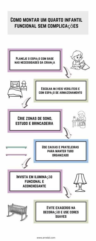 Para facilitar a visualização de tudo que falamos até aqui, criamos um infográfico com os principais elementos de um quarto infantil funcional. Assim, você pode usar como checklist na hora de montar o ambiente.