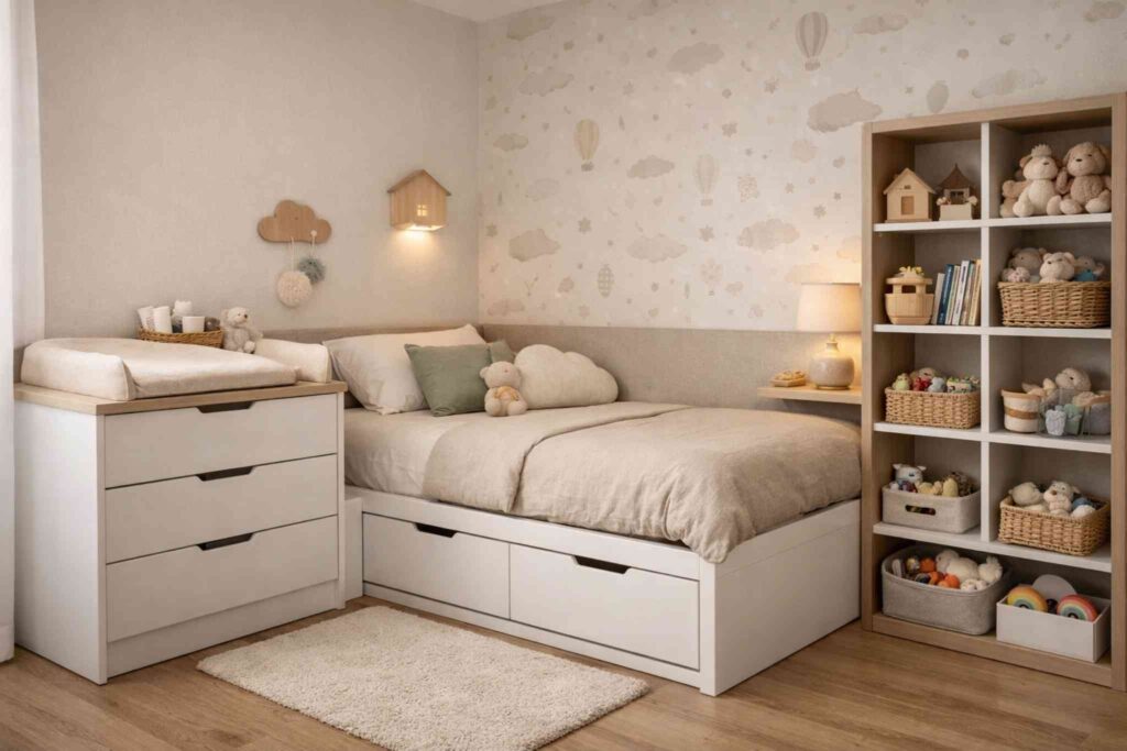 Opte por camas com gavetas, cômodas que também sirvam como trocador ou escrivaninhas com espaço para organização. Móveis multifuncionais economizam espaço e facilitam o dia a dia.