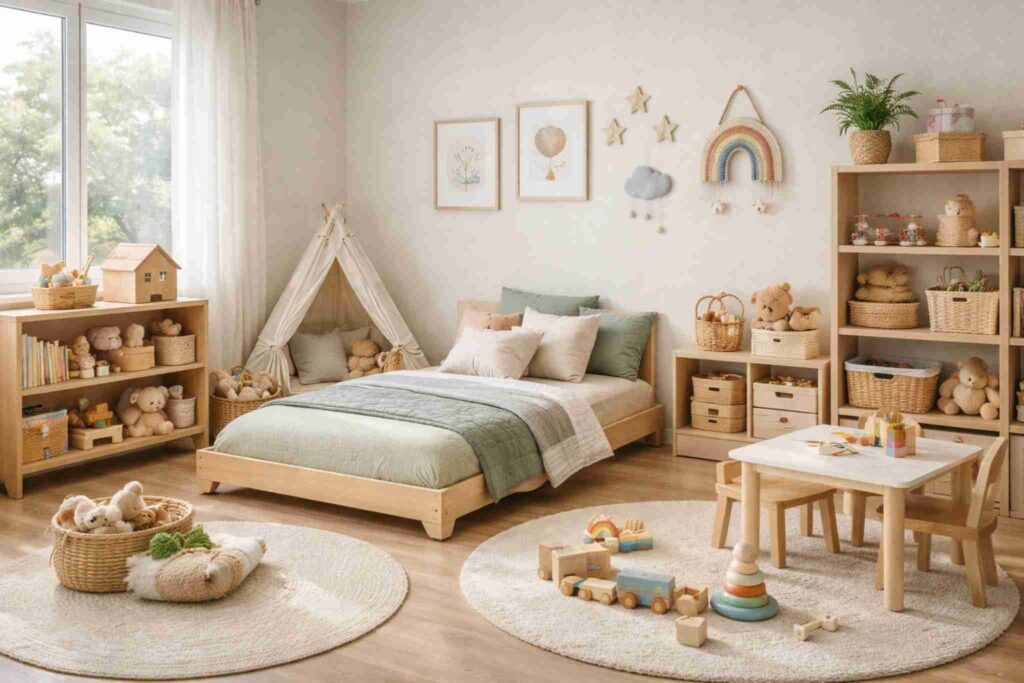 Esse modelo tem cama baixa, estantes acessíveis e brinquedos organizados de forma que a criança possa pegar e guardar sozinha.