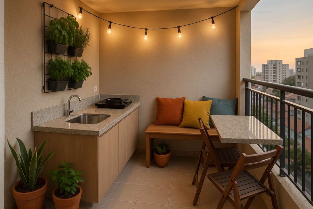 Ambientes reduzidos seguem impulsionando soluções inteligentes: a varanda combina horta vertical, bancada compacta e mesa dobrável, criando um cenário prático para refeições ao ar livre.