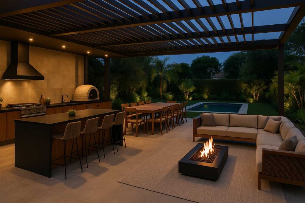 Projeto integra área gourmet, estar externo e piscina em ambiente elegante e climatizado por iluminação cênica.