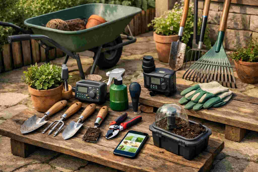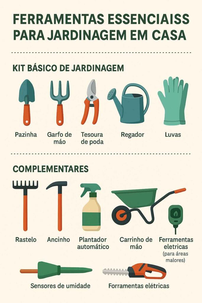 Mesmo para quem está começando com poucos vasos ou hortaliças simples, algumas ferramentas são indispensáveis. Vamos conhecer cada uma delas e entender para que servem.