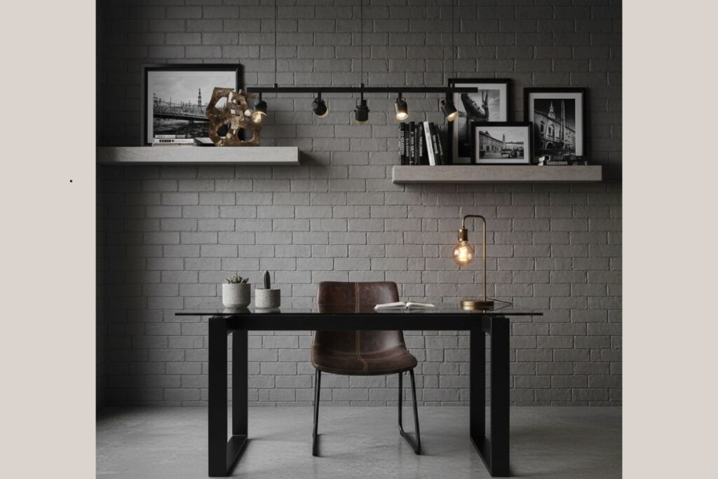 No home office industrial, a mesa de vidro com base em ferro preto cria contraste e personalidade. A cadeira de couro sintético acrescenta conforto e reforça o estilo urbano.