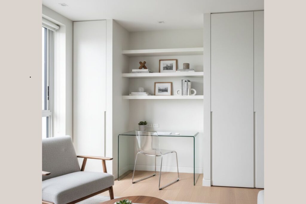 Esse tipo de composição permite integrar o home office à decoração da casa de forma discreta, sem criar divisões visuais pesadas.