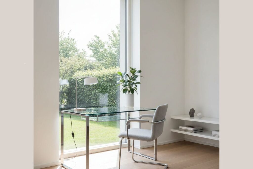 No escritório minimalista, a mesa de vidro com estrutura metálica posicionada próxima à janela potencializa a entrada de luz natural e evita a sensação de peso visual. A cadeira ergonômica em tom neutro mantém o conforto e a harmonia do ambiente.