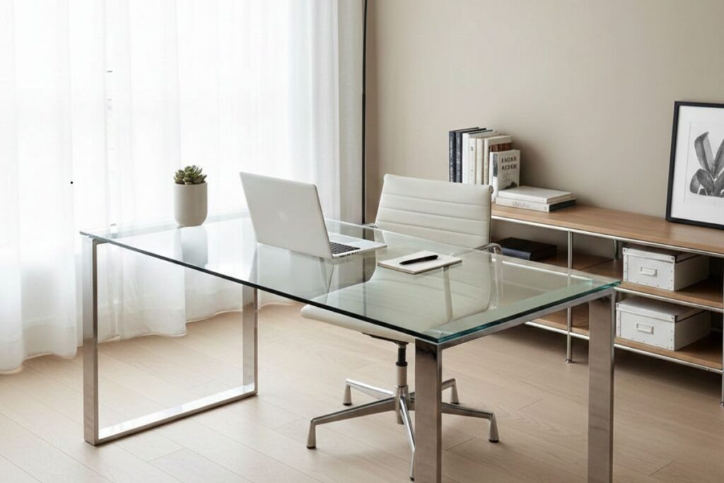 A mesa de vidro é uma escolha comum no home office por transmitir leveza e modernidade, mas nem sempre é a opção ideal para todos os perfis.