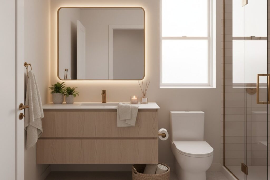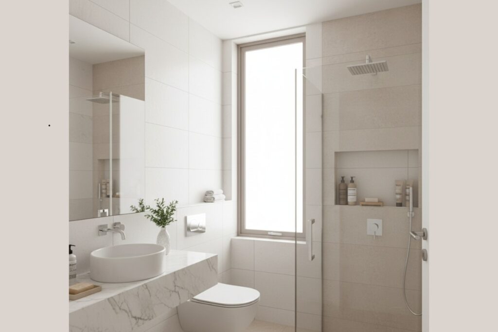 Banheiros pequenos pedem soluções verticais, prateleiras estreitas e paletas claras para ampliar.
