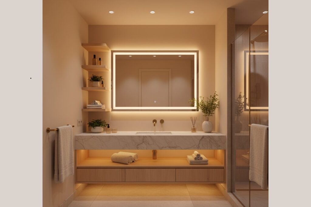 A iluminação interna complementa a luz natural e deve ser funcional. Luzes brancas ou neutras são melhores para as áreas de higiene e maquiagem.