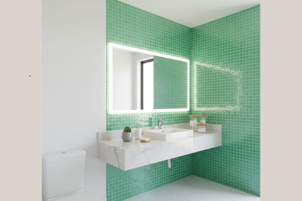 Neste exemplo, as pastilhas verde-menta são o destaque principal na parede da pia. O restante do banheiro segue em branco para manter o equilíbrio visual.