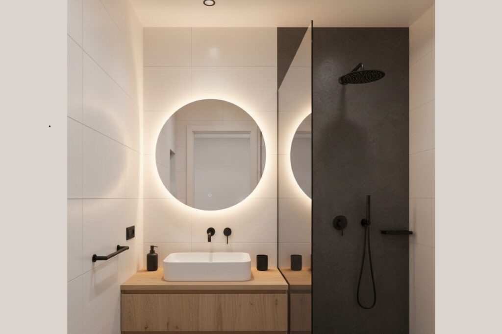 A iluminação embutida no teto e ao redor do espelho redondo gera um efeito elegante e contemporâneo.