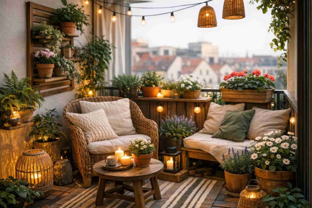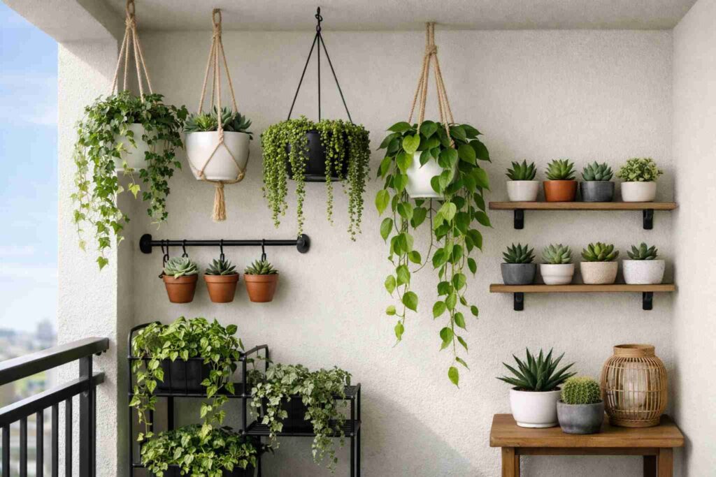 Em varandas compactas, use suportes suspensos, vasos pendurados no teto e ganchos nas paredes. Misture espécies pendentes como hera e jiboia com pequenas suculentas em prateleiras.