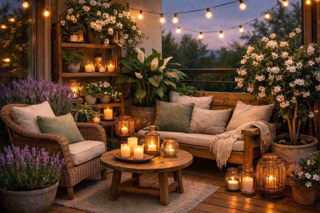 Use móveis de madeira ou vime, almofadas confortáveis e iluminação suave com velas ou luzes de fio. Inclua plantas como lavanda, lírio-da-paz e jasmim para criar um ambiente relaxante e perfumado.