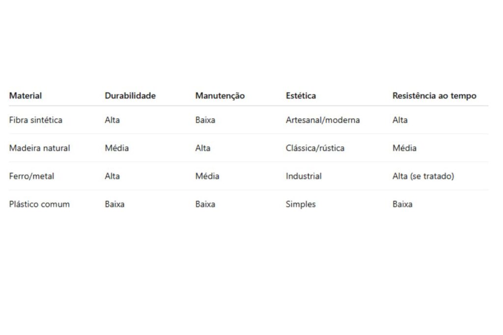 Outros materiais continuam interessantes, mas funcionam melhor quando usados em situações específicas: madeira para ambientes cobertos e decorativos, metal para estruturas robustas e duráveis, plástico para uso casual e temporário.